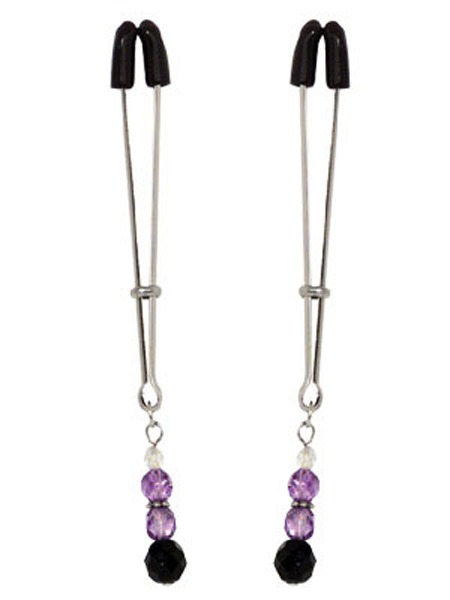 Adjustable tweezer-style beaded nipple clamps with violet purple beads. Soft rubber tips. Adjust the clamps by sliding the metal rings up the tweezers – from merely lovely decoration to pretty strong stimulation. Sold as a pair.