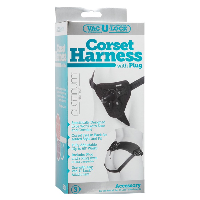 The Corset Harness is built for comfort and rigorous play. Its the epitome of stylish and is easily adjustable to 69″ with pull-to-tighten straps, open crotch and rear, laced corset back, and a snap front for swapping out attachments. Made of smooth black neoprene, the Corset harness works with all Vac-U-Lock attachments as well as strap-on compatible toys. Includes two O-rings. Designed for use by women and men. Washable. Made of smooth Neoprene Fully adjustable up to 69 for a comfortable fit Lace-up corset back Designed for rigorous play Works with all Vac-U-Lock attachments as well as strap-on compatible toys For use by women and men Washable