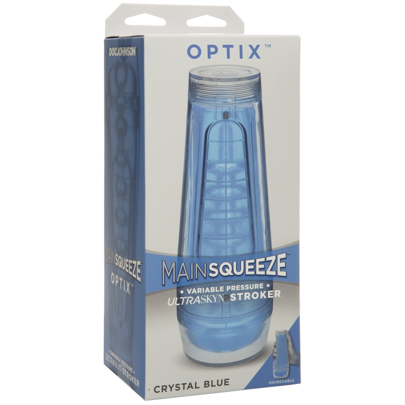 See yourself in a whole new way. The innovative Optix model joins Doc Johnsons Main Squeeze line of variable-pressure hard case masturbators and features a unique completely transparent design that leaves nothing to the imagination. Each part of Optix including the case, adjustable pleasure features, and tight, textured ULTRASKYN tunnel is crystal blue, offering an unmatched visually stimulating experience. As always, Main Squeeze is designed to put the power in your hands, featuring a squeezable grip that lets you vary the tightness of each stroke and a suction-adjusting end cap. The double-cap hardshell design doubles as a travel and storage case, keeping Optix as sleek and immaculate as the day you opened it. Tight, Textured Masturbator with Hard Outer Case Visually Stimulating Clear Material Squeeze Plate Allows User to Control Pressure End Cap Creates Intense Suction Base Twists to Adjust Suction Strength Fully Disassembles for Cleaning Complete Care and Usage Instructions Included