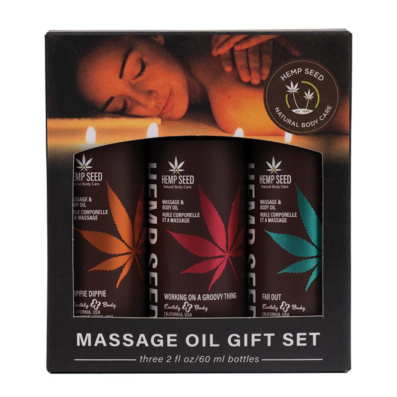 Summer Massage Oil Gift Set Our 100% natural blend of essential oils (including hemp, almond, grape seed, apricot and vitamin E) provides a slick, professional glide. Better yet, this nutrient-rich formula absorbs into the skin for deep conditioning and moisturizing without a greasy residue. Whether you choose unscented or one of our exotic fragrances, you won’t need (or want) to wash it off. Includes 1 of each Massage Oil: 2 oz Hippie Dippie – Fragrance notes: Toasted Coconut, Sparkling Cashmere, Sandalwood 2 oz Working On A Groovy Thing – Fragrance notes: Wild Berries, Night Blooming Jasmine, Warm Amber 2 oz Far Out – Fragrance notes: Blue Citron, Fresh Spring Water, Rose Buds