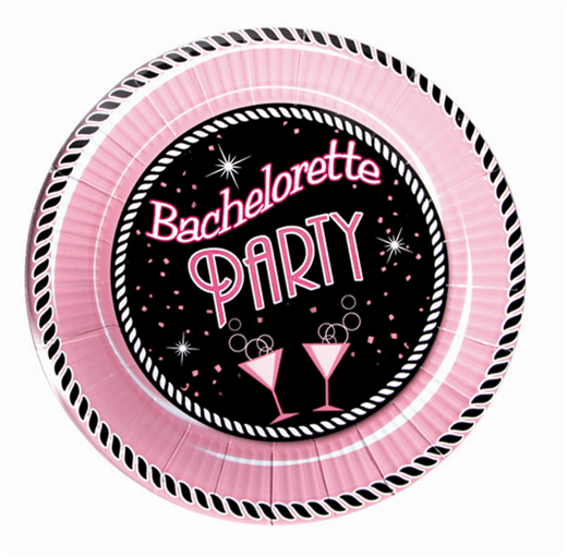 The dinner plates are standard size, measuring 10 inches across. They are pink and black, and accented with stars, confetti and martini glasses.