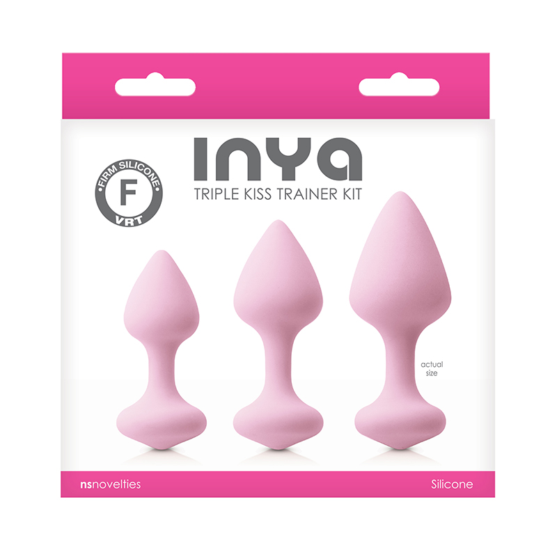 It all starts with a kiss. INYA Triple Kiss Trainer Kit includes an assortment of three firm, silky-smooth silicone plugs, tapered for easy insertion and comfortable fit. With a cute and fun design, youll always remember your first Triple Kiss. Suitable with all lubricants.