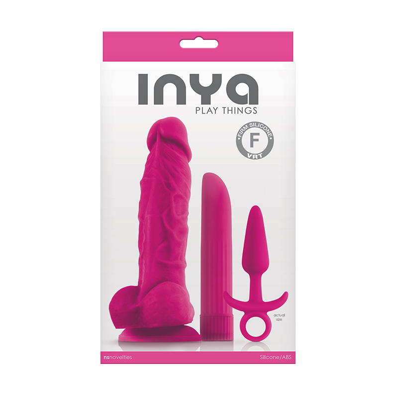 Playtime is always better with INYA Play Things a provocative and vibrant collection of high-end pleasure products! This must-have kit includes realistically molded 5-inch silicone dildo with strong suction cup base, powerful 5-inch ABS vibrator, and stylish, slim-tapered 3-inch silicone pleasure plug. Let the games begin!