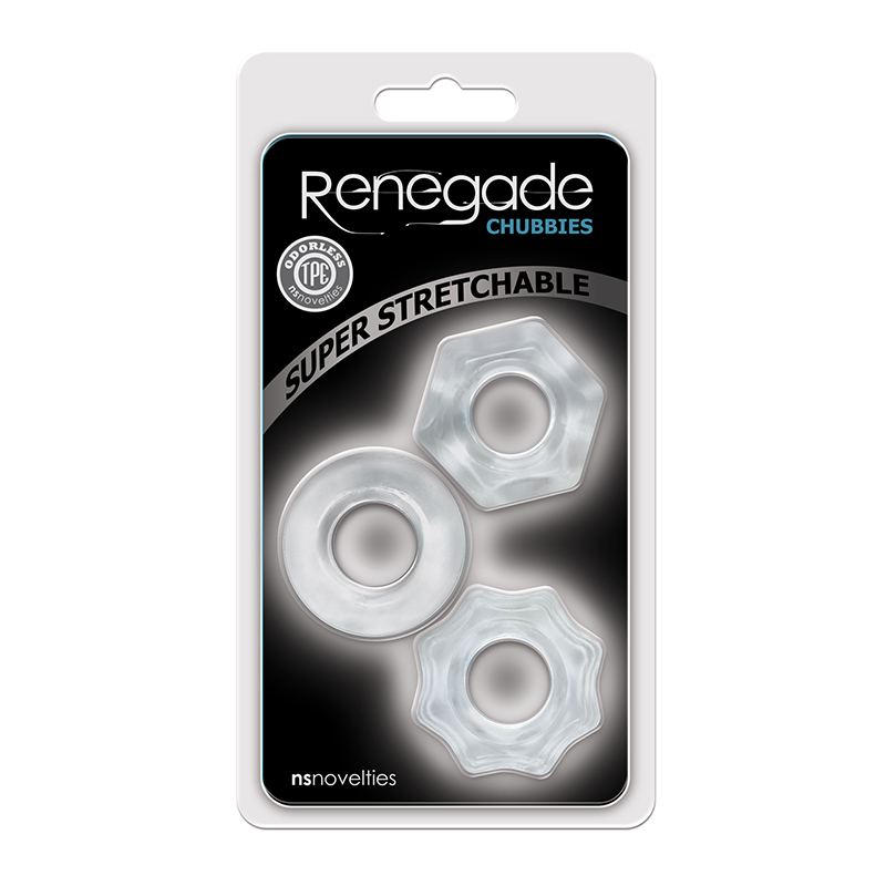 Comfort and control delivered by Renegade Chubbies. Super elastic, these stackable rings have multiple uses. Body safe TPE is suitable with all lubricants.