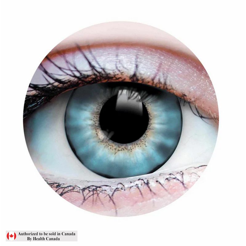 SUNSET OCEAN circle lenses feature a richly textured inner ring of in warm yellow tones, radiating into blue and turquoise hues throughout the iris, which then meet a subtle outer ring. On light natural eyes, the turquoise tones of the SUNSET OCEAN contact lenses come through, for a brighter effect. On dark natural eyes, these beauty lenses add a rich blue outer iris, creating a beautifully contrasted effect with the warmth of their center.