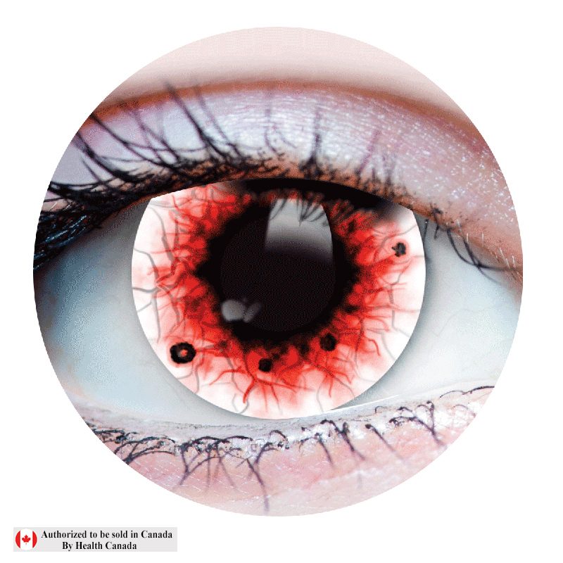 Wraith II Colored Contact Lenses can give you the ethereal gaze of a vengeful spirit or a spooky wraith. These lenses feature a transparent pupil with an opaque white background. Red veins and a blood cloud permeate the center of the lens, and black flecks spread throughout the iris to give a bewitching effect. Wraiths are Scottish water spirits. Are you searching for the look of a soul trapped in limbo? Then our WRAITH contacts are perfect for you. Channel the sorrow of a restless spirit with every blink, embody a vengeful wraith seeking justice, or portray a mythical spirit from folklore. Whether you’re a seasoned cosplayer perfecting your next ethereal character or a Halloween enthusiast seeking a unique look, Wraith II contact lenses are the perfect finishing touch.