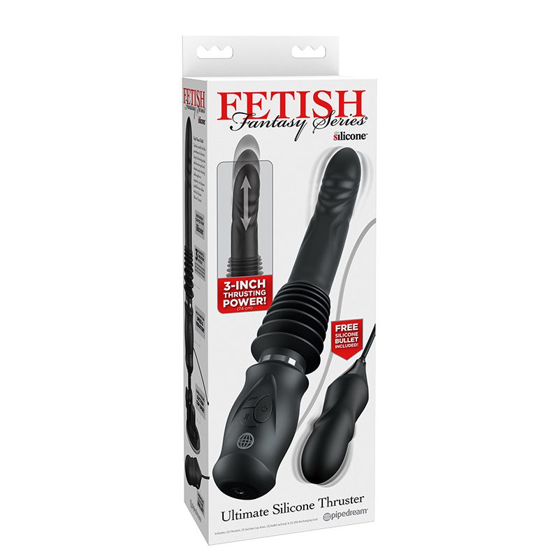 Introducing the Ultimate Silicone Thruster, a revolutionary thrusting vibrator designed to redefine pleasure with its unparalleled performance and versatility. Crafted with ultra-hygienic Elite SiliconeTM, this powerhouse boasts a dynamic 3-speed thrusting mechanism that elevates pleasure to new heights. Combined with 10 unique vibration patterns, the Ultimate Thruster ensures a fully customizable experience to cater to your every desire. But wait-there’s more! Plug in the auxiliary, multi-function vibrating bullet and take your pleasure to the next level! The 27″ (69 cm) cord gives you the freedom of extra indulgence and positioning for yourself-or your partner! Use the detachable suction cup base for a hands-free thrusting thrill ride! The super-strong suction cup sticks to almost any clean, flat surface. Combine the powerful thrusting action, multiple vibration patterns and auxiliary vibrating bullet for an erotic symphony of sensations that promises an experience like no other, whether exploring solo or with a partner. Cleanup is a snap after the fun with antibacterial cleaner and warm water. – 3-inch thrusting power: Powerful thrusting motor penetrates you deeper with 3 extra inches of thrust, and 3 orgasmic speeds! – Vibrating silicone bullet adds a new dimension to your pleasure possibilities! – Dual-purpose USB-C port powers the bullet and recharges the thruster! – Super-strong removable suction cup base sticks to almost any flat surface! – All functions can be used together or independently!