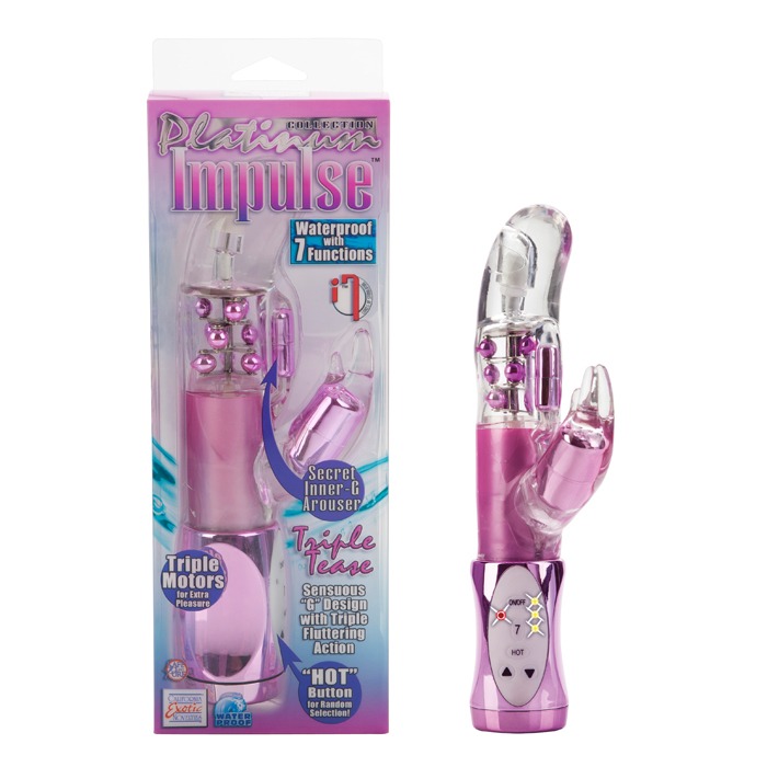 Triple motors for extra satisfaction! – Fluttering triple stimulator – Intense micro motor for inner-G arousal – 7 functions of vibration, pulsation, and escalation – 3 speeds of shaft rotation – 3 rows of non-jamming metal beads – Hot button for random function selection – Easy load battery pack – TPE (stimulator) ABS with metallic plating (controller, bullets) Stainless Steel (beads) – 4 AAA batteries – 4.5″x 1.75″/ 11.5 cm x 4.5 cm (shaft) – 2.25″x 1″/ 6 cm x 3 cm (stimulator)
