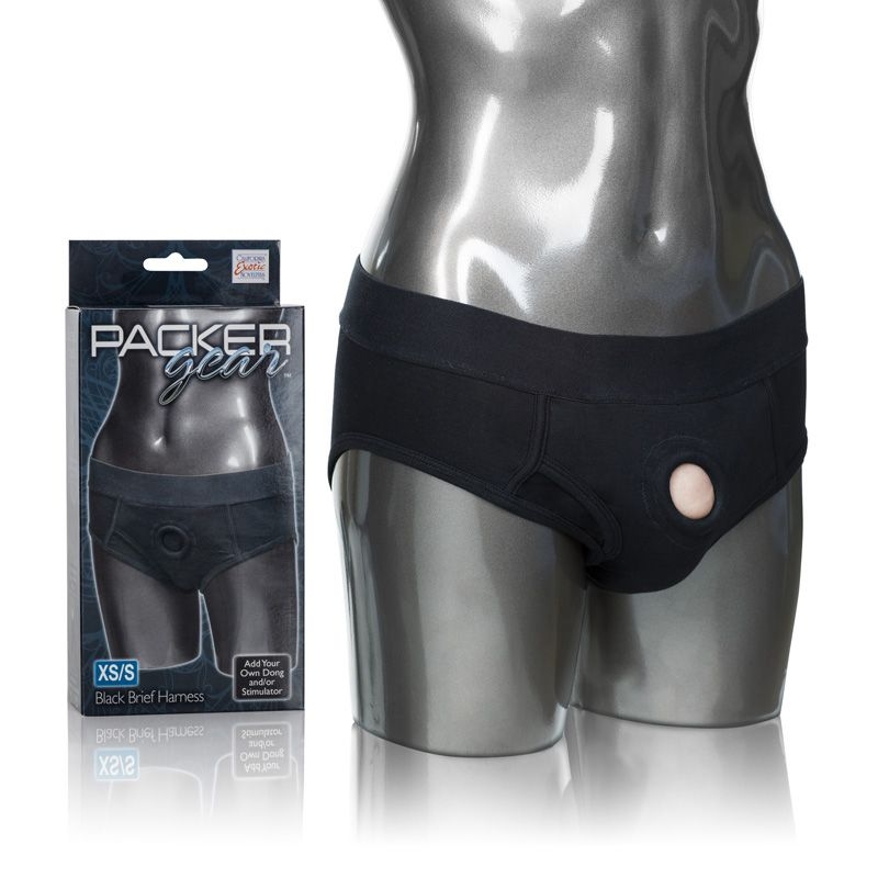 Soft and Comfortable The soft and comfortable Packer Gear Black Brief Harness is designed for easy wear and ultimate penetration satisfaction. The hipster cut panty has a fashionable masculine style and internal pockets to store your favorite vibrating stimulator. For one-on-one erotic action, slip on the briefs and insert a power-packed dong. The washable Packer Gear Black Brief Harness is made from soft, stretchy and comfortable cotton/spandex and has an extra wide waistband for full support. The ultra soft lining features internal pockets and an internal strap that secures your packer firmly in place. The reinforced 2-panel design also has a stretchy O-ring that easily accommodates most sizes of tantalizing packers, dongs or probes. For your comfort and pleasure, these discreet brief harness offer exceptional support of any other toys during stimulation. The comfort fit Packer Gear Black Brief Harness has no adjustable straps or buckles. The easy wear briefs slip on like underwear and fit like a glove. To experience orgasmic partner penetration pleasure all you have to do is select your favorite pleasuring tool. Insert a bullet shaped vibrating stimulator into the internal pocket and enjoy double the ecstasy.