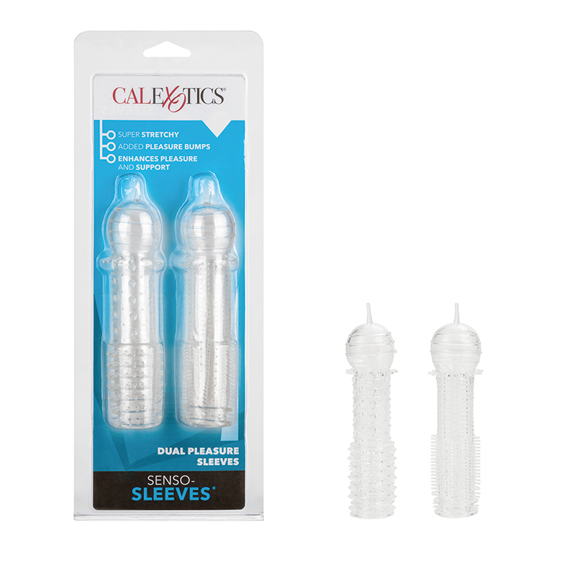 Play out your erotic fantasies with the super-stretchy, transparent Senso Sleeves. The pair of textured phallus enhancers is designed for intimate exploration of the exotic and erotic kind. The easy to use ribbed and noduled sleeves comfortably fit over the phallus for elevated stimulation pleasure that is always mutually enjoyed. The Senso Sleeves are made from smooth, soft and unscented, hygienically superior phthalate free Senso (TPR)The ultra stretchy stimulation enhancers feature pleasure nodules, flexible teasers and ticklers, and a ribbed bulbous tip for unlimited sensual seduction and ecstasy. Choose your preferred textured design, and slide the sleeve directly onto the erect phallus for instant sensuous pleasure. Maximize the tantalization and sensitive sensations byusing a water-based lube with these versatile toys. The textured Senso Sleeves are perfect for beginners, and ideal for an exotic toy collection. Use your imagination, and extend your seduction play with the stimulation duo. Explore your wildest dreams and red-hot fantasies by indulging in your desires and elevating your personal pleasure. Spice up the intimate fun by alternating between the seductive textures and arousing teasers. Each transparent sleeve is made for sheer pleasure. Before and after every use, clean the comfort fit sleeves with a toy cleaner spray or wash in warm, soapy water.