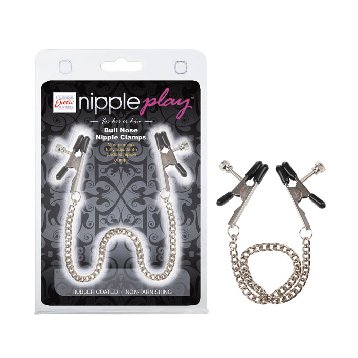 10.5″/27 cm (chain) 2″/5 cm (clamp) – Adjustable tension, non-tarnishing nipple jewelry – Latex dipped (tips) Steel with silver plating (prongs)