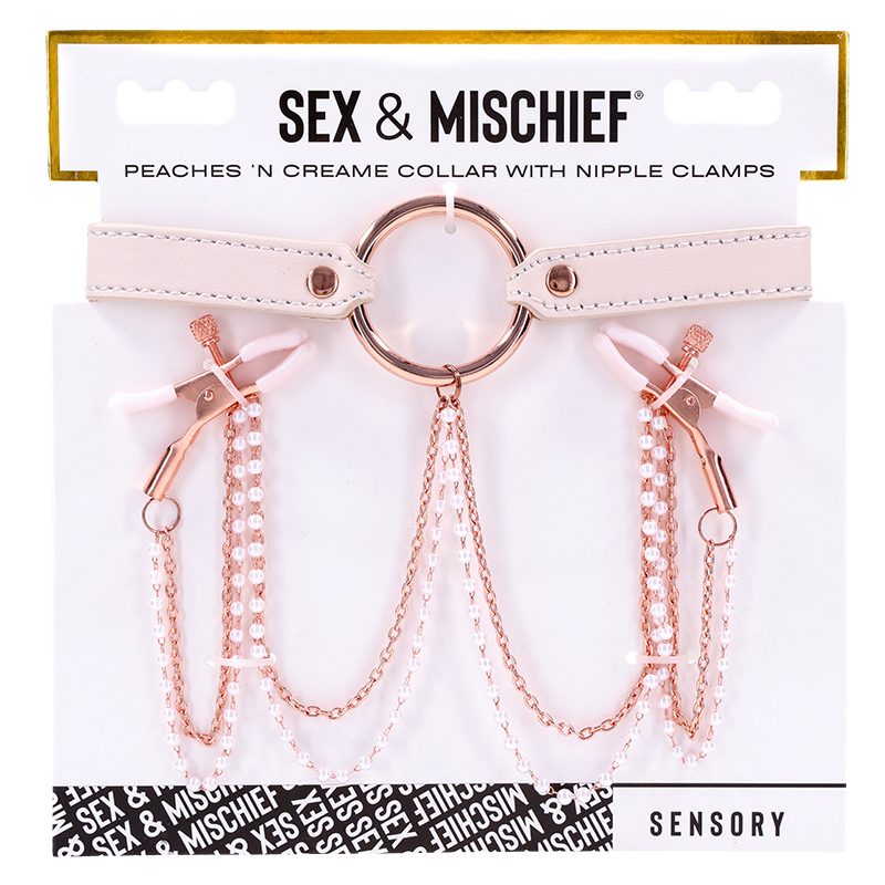 Spice up your playtime with the Peaches ‘n CreaMe Collar with Nipple Clamps and experience extraordinary pleasure! This playful accessory blends luxury with a touch of naughtiness, featuring a delightful peach-colored collar adorned with rose gold hardware and tantalizing attached nipple clamps! The soft faux fur lining ensures comfort, while the adjustable collar guarantees a snug fit for all peach enthusiasts. Secure the rose gold clasp, let the nipple clamps do their flirty magic, and get ready to turn up the heat in your intimate moments. Whether you’re a curious beginner or a seasoned adventurer, this playful accessory adds a dash of charm and a hint of sweetness to your escapades. Features: – Faux leather collar snap adjustments from 14″ to 17.5″ – Nickel-free rose gold hardware with white faux pearl chain – Rubber tipped nipple clamps with tension adjustments Materials: 40% Polyurethane, 35% Iron, 20% ABS plastic, 5% PVC